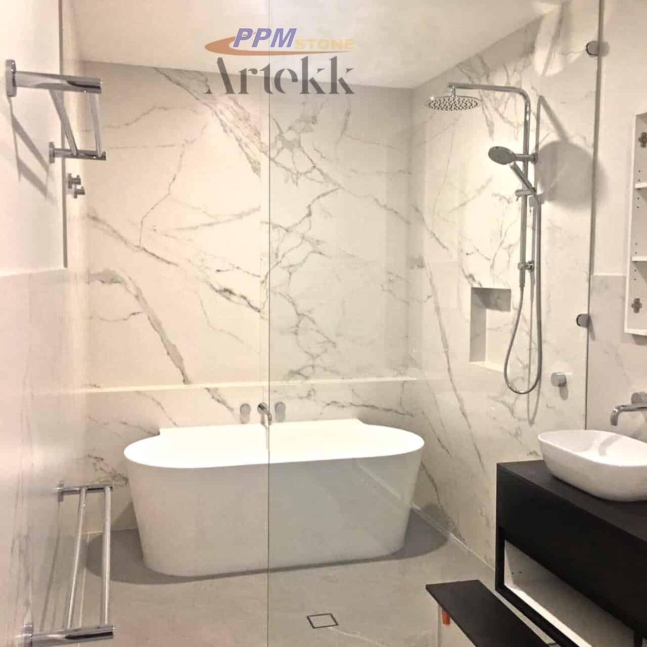 Porcelain Panel Bathroom Tile Job With Calacatta Floor To Ceiling