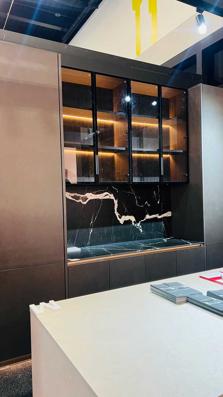 The design of Stand Q1 was more than just functional—it was a statement of elegance and craftsmanship. The booth featured full-scale porcelain applications in kitchens, bathrooms, benchtops, splashbacks, and feature walls. With natural light beaming across the surfaces and ambient lighting highlighting textures and tones, the setup attracted hundreds of architects, developers, designers, and homeowners curious to explore material innovation.